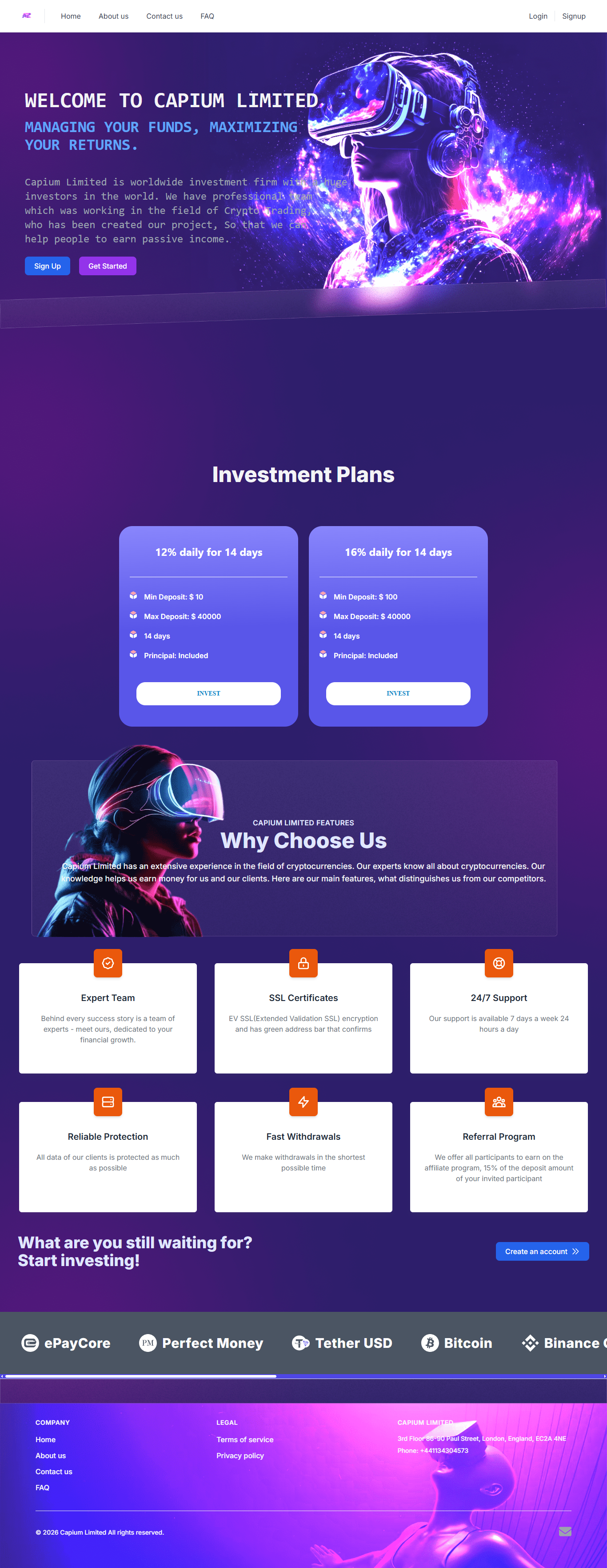 Capium Limited is worldwide investment firm with a huge investors in the world. We have professional team which was working in the field of Crypto Trading, who has been created our project, So that we can help people to earn passive income.Comments: